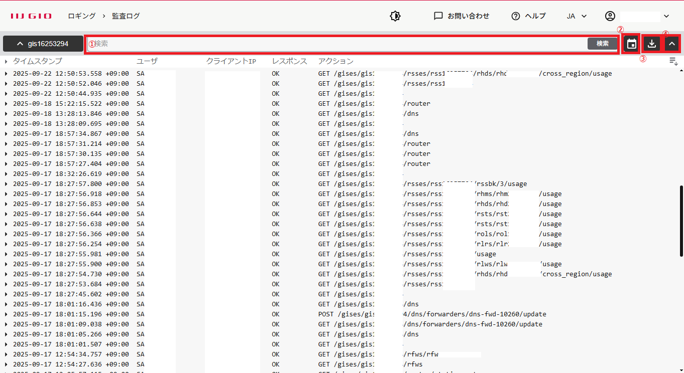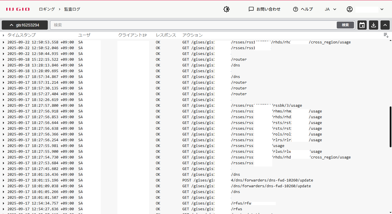 | クライアントIP | 実行したユーザの接続元IPアドレスが表示されます |